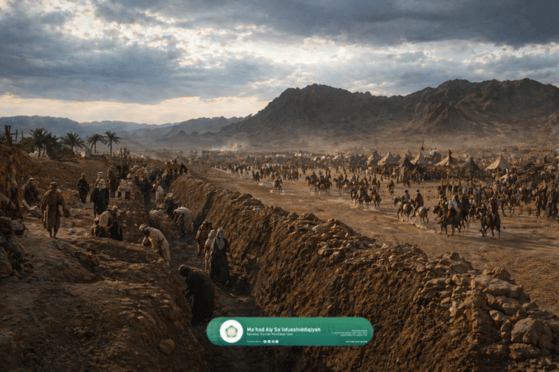saiidusshiddiqiyah.ac.id—Madinah pernah menghadapi saat paling genting dalam sejarah awal Islam. Pasukan besar yang terdiri dari Quraisy, Bani Nadhir, dan sejumlah kabilah Arab lainnya bersekutu untuk menghancurkan Islam. Peristiwa besar ini dikenal dengan nama Perang Ahzab, merujuk pada banyaknya kelompok (al-ahzab) yang bersatu menyerang Madinah. Perang ini juga disebut Perang Khandaq karena Rasulullah SAW memilih taktik pertahanan dengan menggali khandaq (parit lebar) yang memutus langkah musuh dan mengubah jalannya perang.